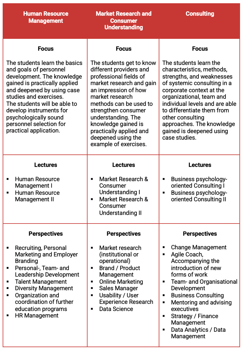 In addition, courses such as social psychology, controlling, project management and industrial and organisational psychology are used to further deepen the business and psychological knowledge already acquired.