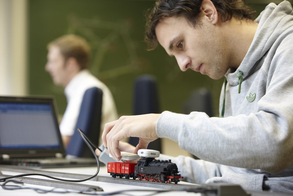 The Laboratory for Sensor and Identification Systems houses computer workstations and various servers where student projects can be realized. In addition to the computer workstations, various mobile devices such as iPads, iPhones and Nokia devices are available to realize projects with mobile applications. These include, for example, geovisualization, 3D city models for mobile navigation systems, or a mobile carfinder for car2go (Daimler AG), which locates available vehicles outdoors using GPS and indoors using sensors such as gyroscopes and acceleration sensors. The laboratory also has a system for indoor real-time location installed, which uses active RFID technology to identify and track objects in 3D. For example, a forklift truck in a warehouse could be controlled automatically. Using passive RFID tags, a package to be shipped can provide information about the destination in the form of an RFID tag attached to the package itself. A reader can then determine whether the parcel has been packed into the right vehicle, which will travel the appropriate route. In order to be able to simulate such example scenarios, the laboratory has appropriate hardware in the form of RFID readers and RFID tags as well as a software platform for managing objects and RFID tags linked to these objects and the readers with the associated read events.