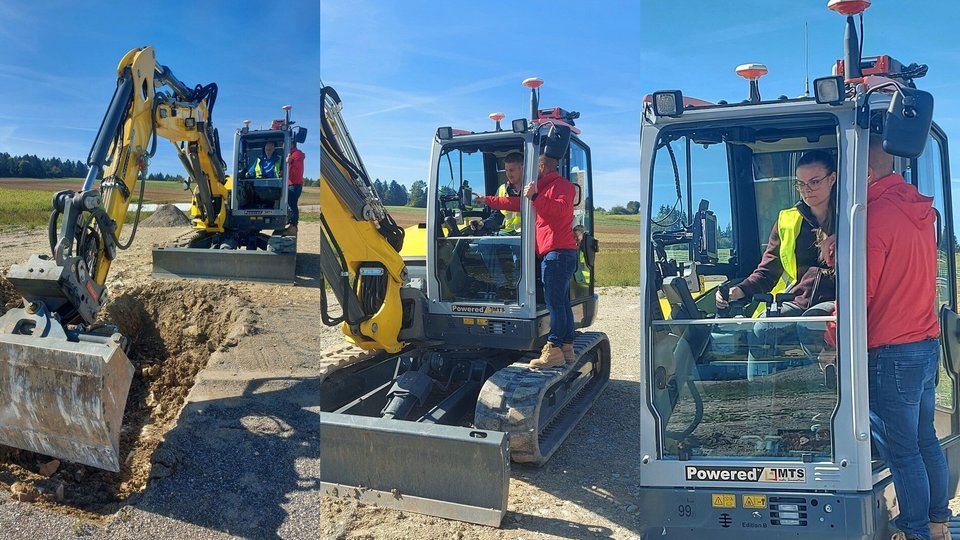 After a short welcome by the lecturer Dr. Alexander Beetz and the managing director Rainer Schrode, there were three interesting stations for the students to see. In addition to the tour of a BIM construction site in Hayingen, the students were allowed to get active themselves. With a GNSS construction site rover, fictitious points were measured and staking out for an excavation pit was carried out. The highlight of the day: the students and also the professors were allowed to try out the machine control in a real excavator themselves.