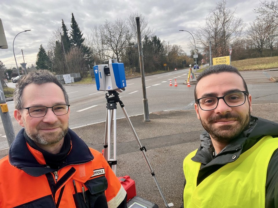 For this to work, the reality must first be digitized in 3D. Employees of the Surveying and Geoinformatics program have therefore extensively surveyed the intersection area with a laser scanner. With the help of the resulting 3D point cloud, tablets and smartphones can then determine their location and the angle of view precisely enough. The LIDAR sensor built into these devices detects 3D structures in their surroundings, then compares them to the 3D point cloud and can then precisely determine the position and viewing direction.