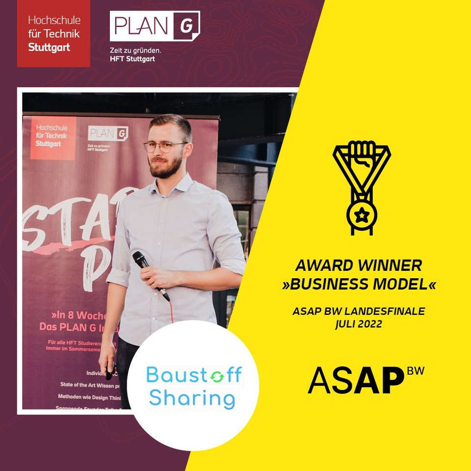 The "Business Model" Award, endowed with 500€, was won by the team Baustoff Sharing: Julian Heid and Stefan Kleppe: "We help craftsmen avoid the wasteful disposal or unnecessary storage of leftover building materials by quickly and easily purchasing, processing and offering other craftsmen and private individuals the opportunity to buy building materials that are no longer used, both physically and digitally, via a standardized purchasing process.