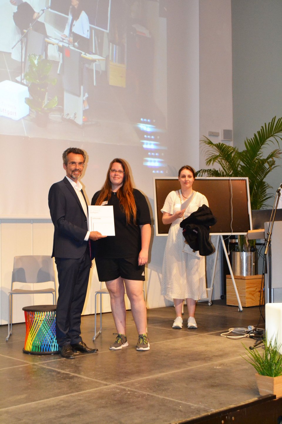 This year's student engagement award went to Ann-Kathrin Brodel (Faculty A, MA Architecture), Linus Häberle (Faculty B, BA Business Psychology) and Stefanie Prahl (Faculty C, BA Surveying and Geoinformatics) for their outstanding, university-wide involvement in various university committees and beyond. The prize in a total amount of 600 Euros was sponsored by the Friends of HFT Stuttgart Association and presented by the chairman Mr. Bernd Göhner.