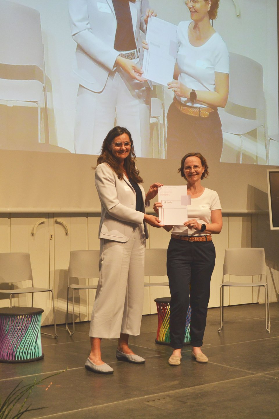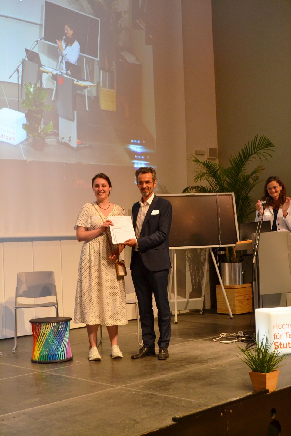 The highlight of the event was the awarding of the teaching prize and the prize for student commitment. The teaching award recognizes outstanding teachers for their innovative teaching methods and their contribution to the further development of teaching and studies at HFT Stuttgart. Winners of the 4th Teaching Award 2023 in the amount of 5000 euros were Prof. Christine Kappei (Faculty A) and Prof. Dr. Siri Krauß (Faculty B) for their cross-course teaching concept BIM AVA and Construction Management I. In her laudation, Ms. Rade emphasized that the two professors convincingly demonstrate how interdisciplinary collaboration between students of architecture and civil engineering can be facilitated in the digital tendering and contracting process. In the course, students reflect on their own professional actions in a special way by directly experiencing the consequences of their decisions in the interdisciplinary collaboration. Even though only one teaching prize was awarded, the concepts submitted make it clear how high the teaching quality is at the university. All three faculties were represented among the best concepts and presented convincing teaching and learning scenarios, which will also be presented beyond the Gallery Walk in the Confluence Wiki.