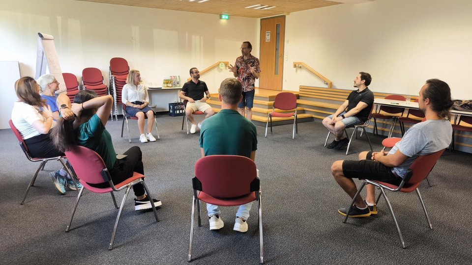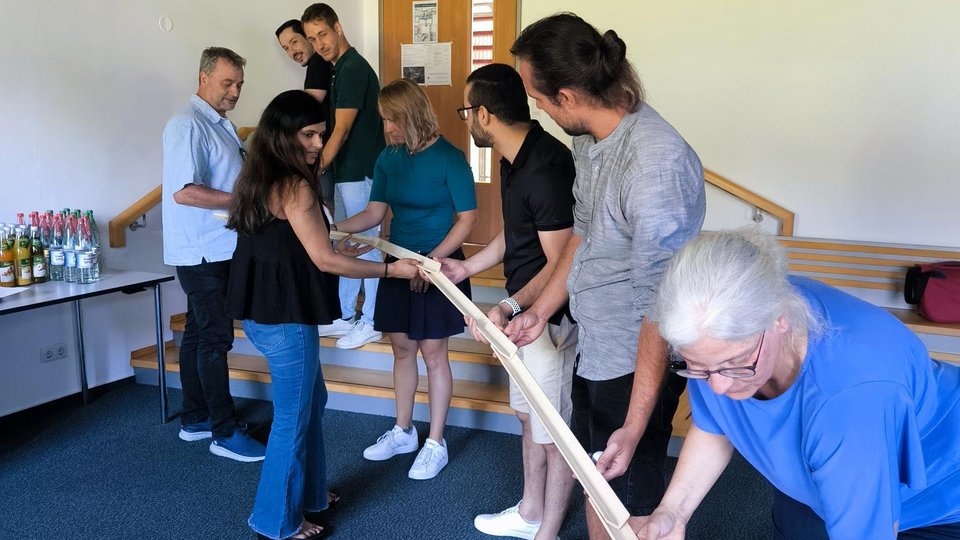 In addition to the extensive scientific program, the doctoral students also took part in an improvisation workshop aimed at developing soft skills, particularly skills such as self-presentation and teamwork. Dr. Daniela Claus and invited speaker Martin Esters facilitated the impo-theatre workshop and team-building activities, where a marble run made of wooden tracks had to be set rolling in a very short time.