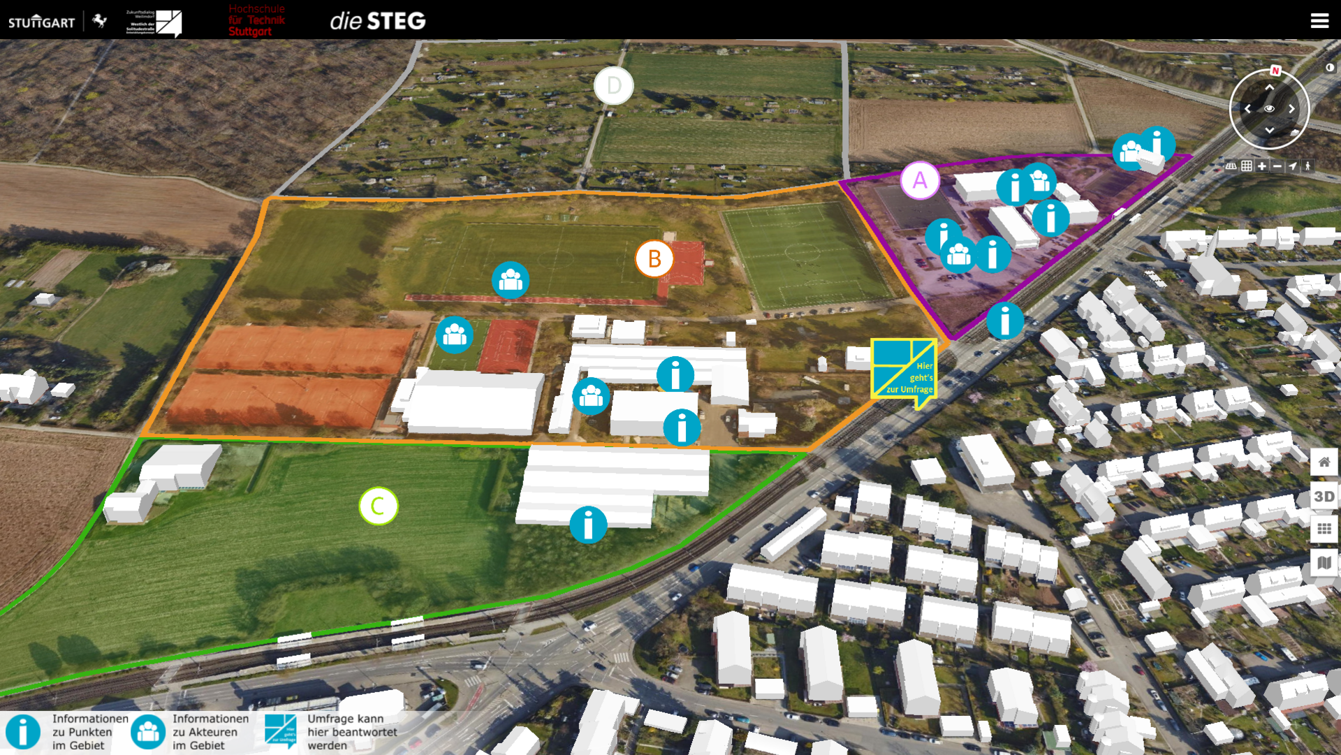 On the 3D participation platform, the people of Weilimdorf can navigate through various areas A, B, C and D in the planning area to the marked points where new projects are to be developed. In the area A of the interactive 3D map, the citizens are informed about existing ideas, for example to realise a community centre for the association and cultural work. Area B is characterised by sports-related use. Here there are already sports fields, athletics fields or tennis courts, for which further development is planned. Area C, where a nursery used to be located, has mainly green open spaces. A club is currently running an "urban gardening" project there as a temporary, time-limited project.
