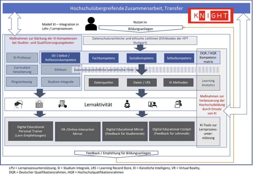 The Stuttgart University of Applied Sciences has set itself the goal of taking a leading role in the use of AI in teaching. To this end, a multi-layered model is being implemented in the KNIGHT project to reconcile different user groups, needs and activities. The following areas will be developed: