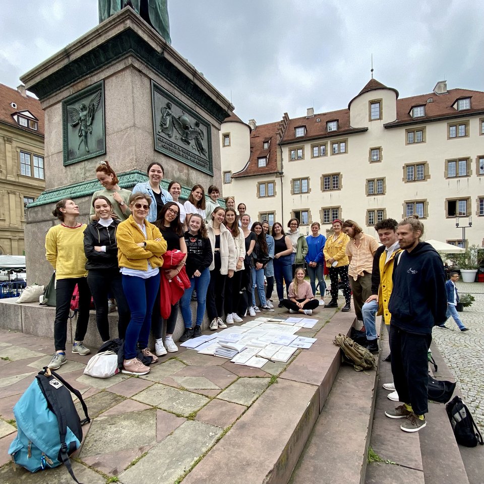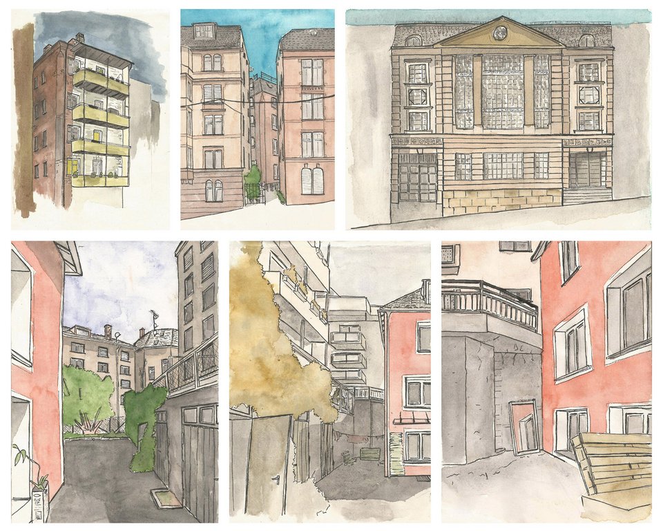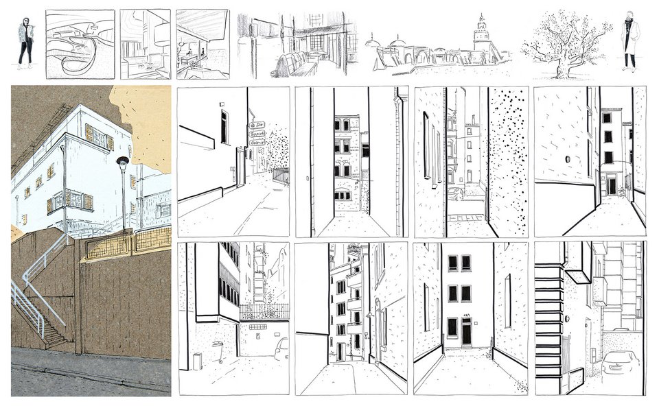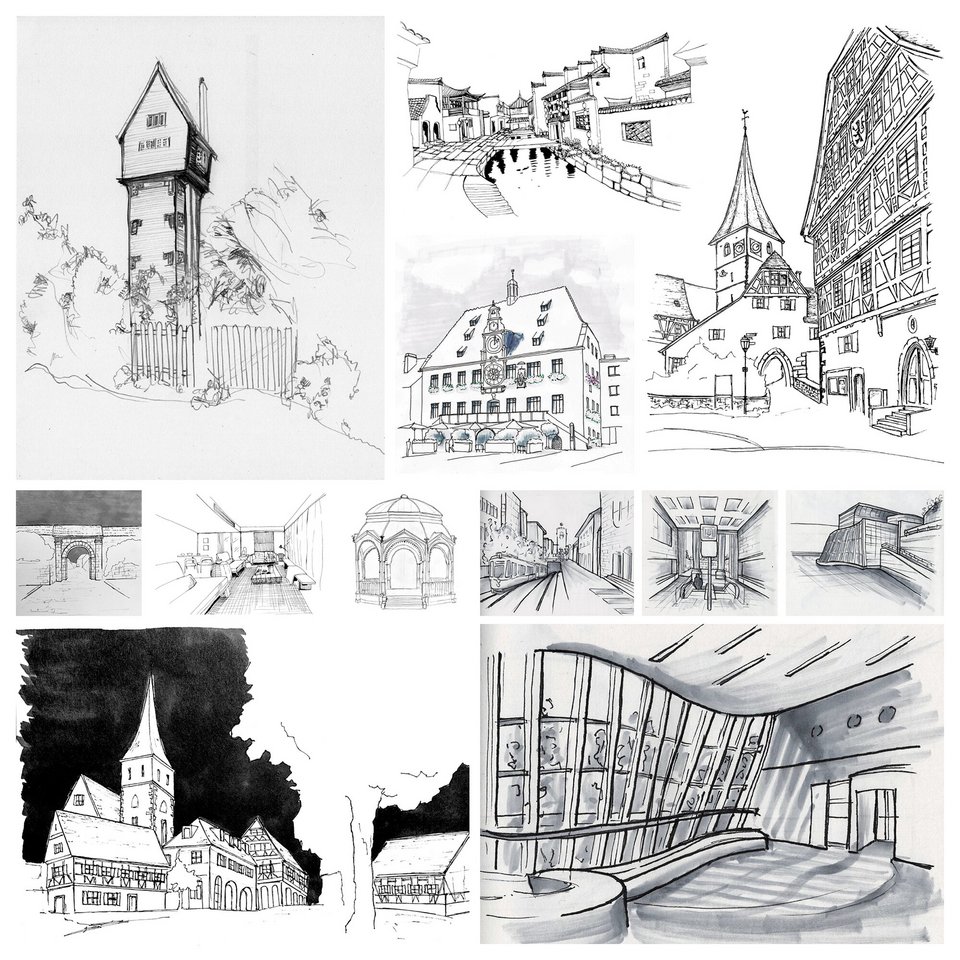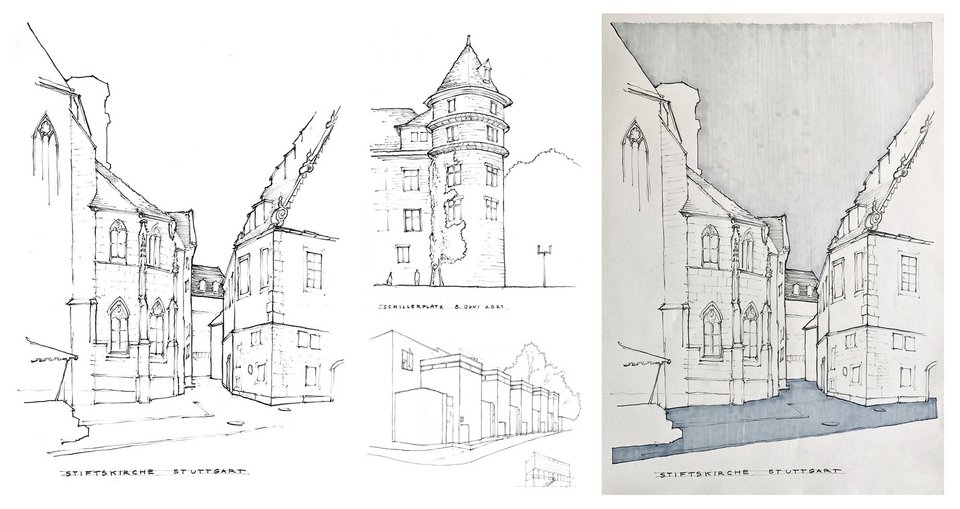 The exercises in the third online semester were devoted to different topics and aspects of spatial drawing. Special attention was given to architectural drawing as "speed sketching", i.e. sketching quickly with a time limit, and to tonal representation with different media. Thanks to low incidence numbers, two events in presence were scheduled at the end of the semester in the Weissenhofsiedlung and on Schillerplatz.