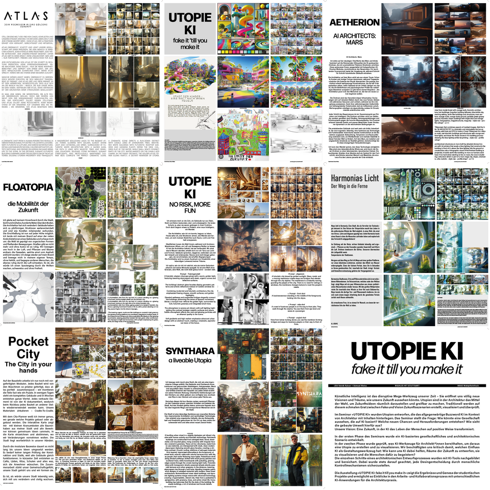Artificial intelligence is the disruptive mega-tool of our time - it opens up completely new visions and dreams of what our future could look like. In architecture, utopias are the means of choice to spatially represent ideas for the future and make them tangible. Traditionally, future scenarios are created, visualized and tested on this fine line between fake and vision. In the “UTOPIE KI” seminar, utopias were designed that provide content for the ubiquitous buzzword AI in the context of architecture. The seminar poses the question: What could a society based on AI look like? What new opportunities and challenges will arise? What does the built environment look like for this? Our vision: A future in which AI transforms people's lives in a positive way.