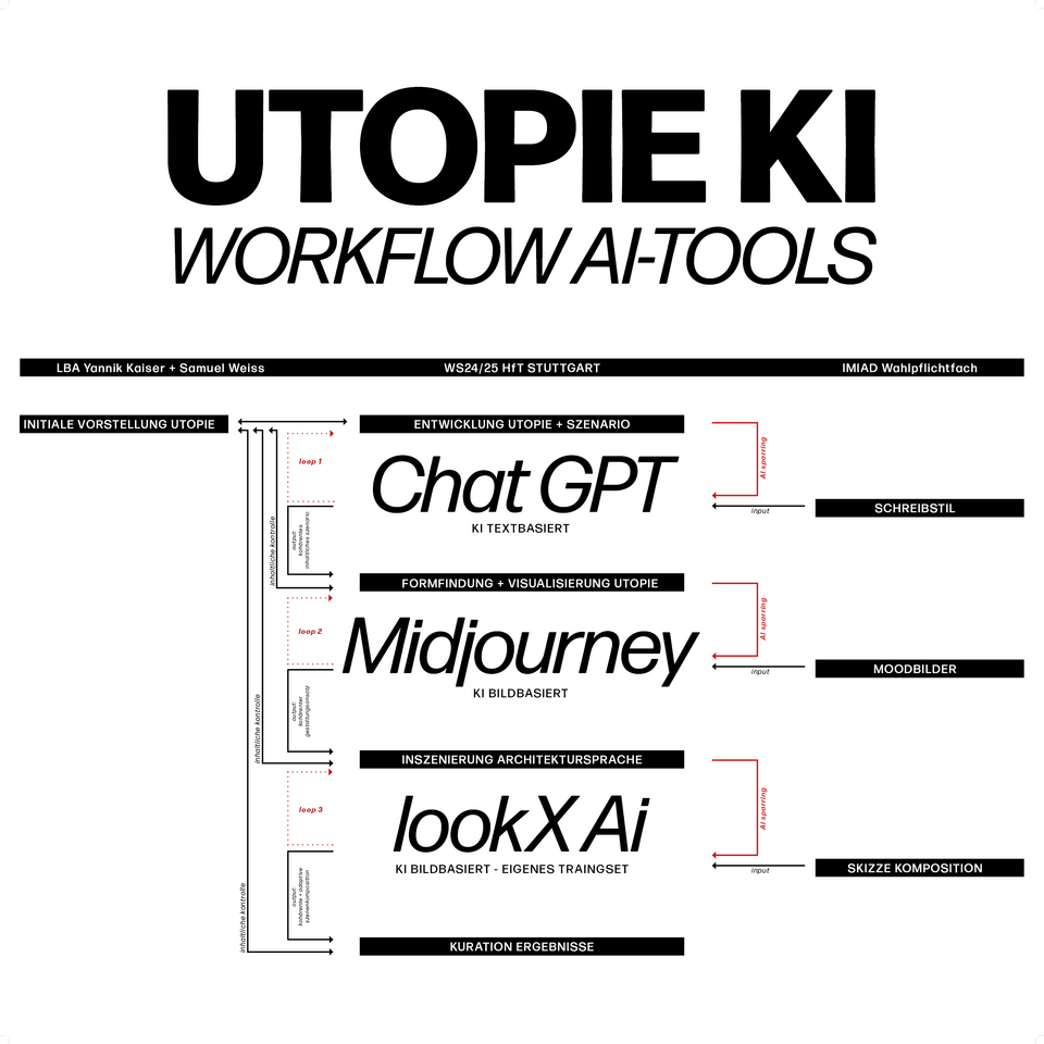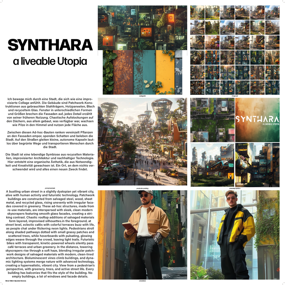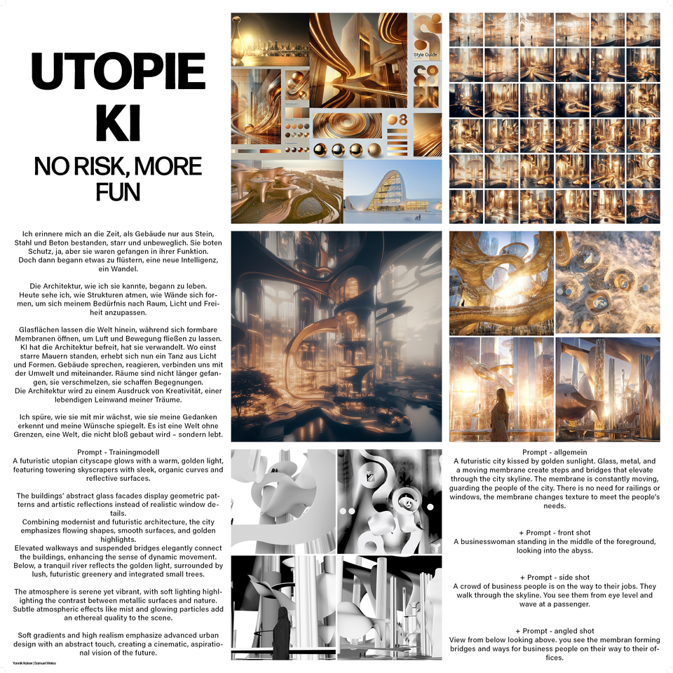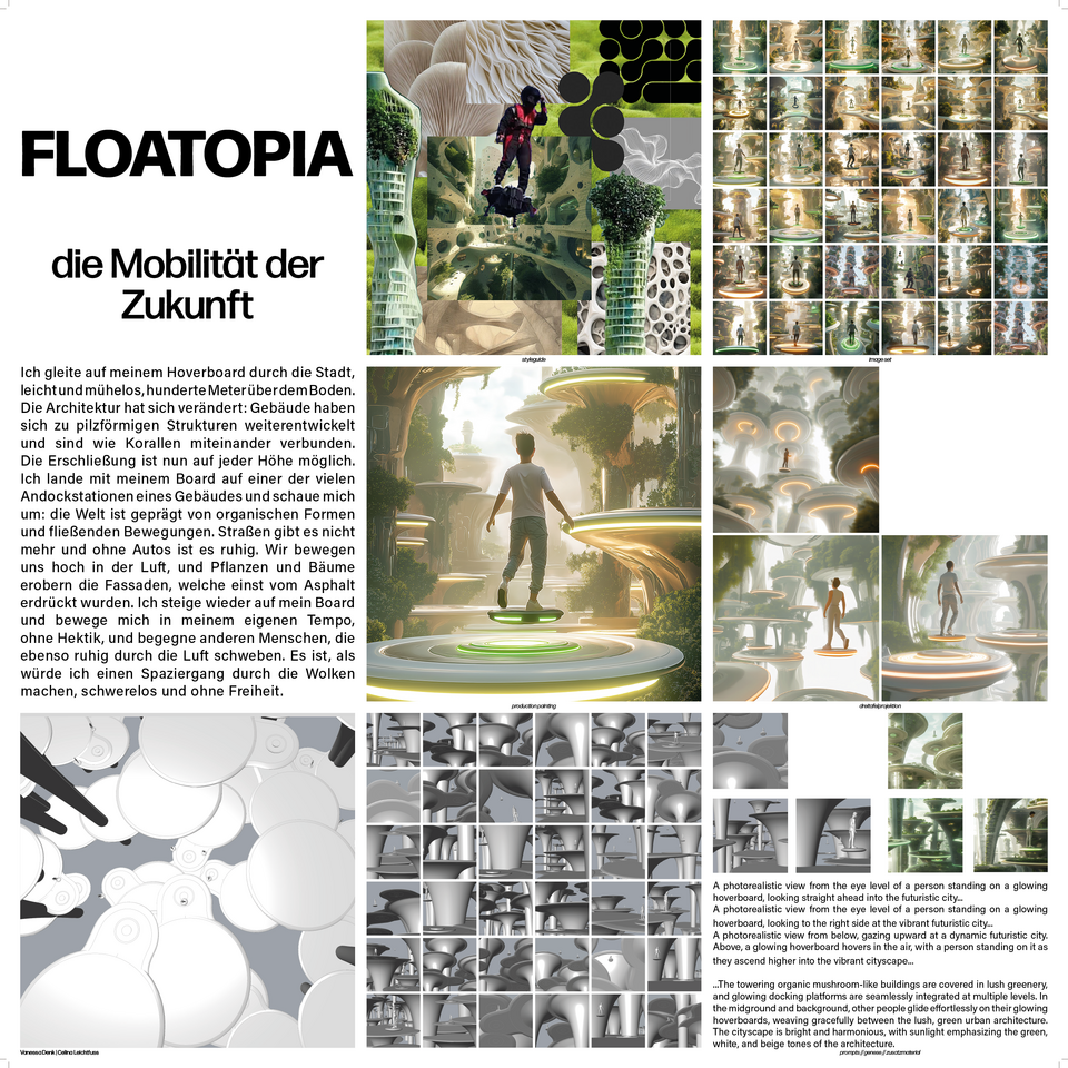 In the first phase of the seminar, an AI-based social and architectural scenario was developed. In the second phase, we examined what AI tools are available to architects to create and visualize a utopia. We took a critical look at the influence of AI as a design tool: How can AI help us design spaces of the future, visualize them and get people excited about them? The individual steps of an architectural design process were recreated and enriched using AI tools. Care was always taken to ensure that every design decision was backed up by human control mechanisms.