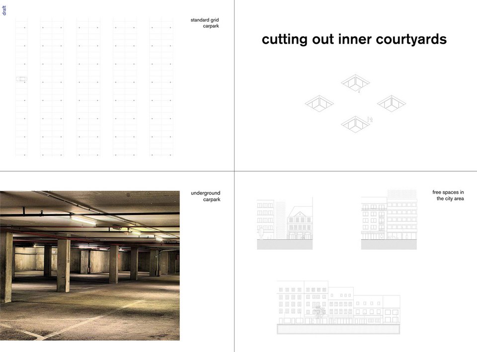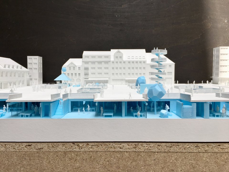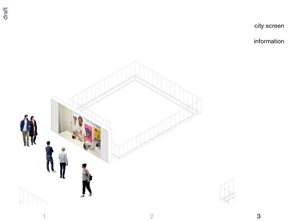 The draft begins with the point that the differentiated opinions of the political underground movement often fail to make the leap to reality. A politically functioning public space does not exist and invisibility to the outside is the consequence. As the new generation of tinkerers, lateral thinkers and do-gooders, as well as their deeds, visions and actions, must be seen, a new public political space will be created within this work. The purpose of this space is to enable the committed society to engage in their own ideas and thus to propel and demand traditional party politics. For the differentiated ideals of society to become visible, to gain attention and to grow, the public must be actively involved. Discussions need to be organized, protests launched, ideas realized and information disseminated and exhibited. The new space must be created in the public, for recognition and growth can only be given to someone who is present and seen. To locate the design in the overcrowded cities of the present, the combination of underground parking and public space is used, which can be found in almost every city. As the private car loses importance, the use of this space will be in the future in disposition. Using the example of Mannheim‘s marketplace, a new structure over- or rather „underlays“ public space. The architecture works like a common working space with workplaces for individual initiatives, common areas and serving spaces. This can create synergies between the different initiatives. Points of contact that ensure continued visibility and information flow ensure a lively exchange with the public.