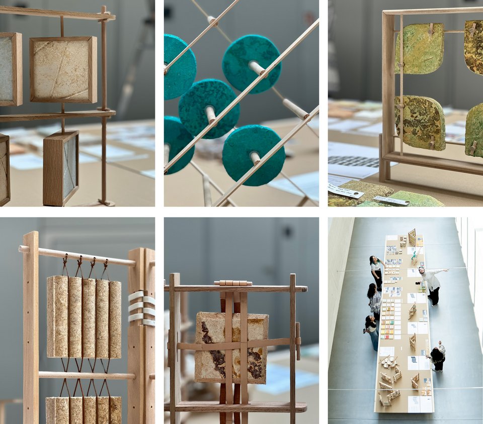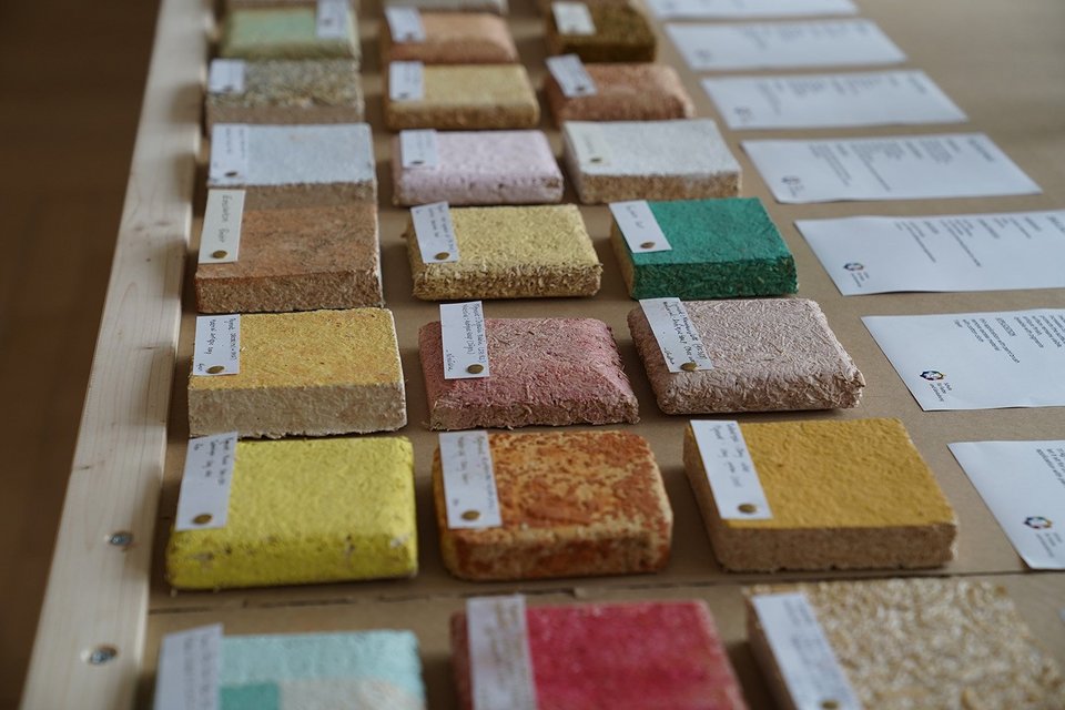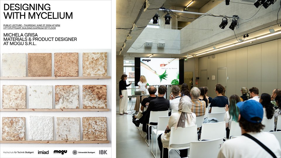 Students of the International Master of Interior-Architectural Design (imiad) at the Stuttgart University of Applied Sciences addressed this question in a seminar in the summer semester of 2024. During a factory tour of Mogu, a manufacturer of mycelium acoustic panels in Northern Italy, we were able to take a look behind the scenes of the still young but steadily growing production facility. We learned how scaling up to an industrial scale takes place and what challenges and opportunities can arise in the commercialization of mycelium products. The students then examined mycelium panels for mechanical workability and experimented with different natural coatings and colours to optimise the aesthetic qualities of the material.