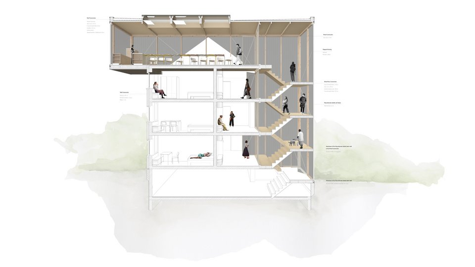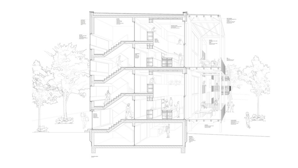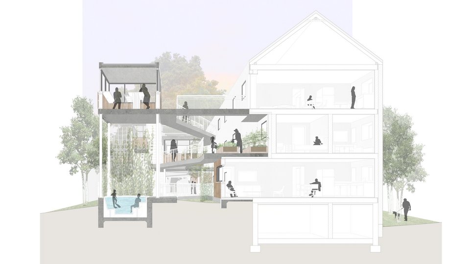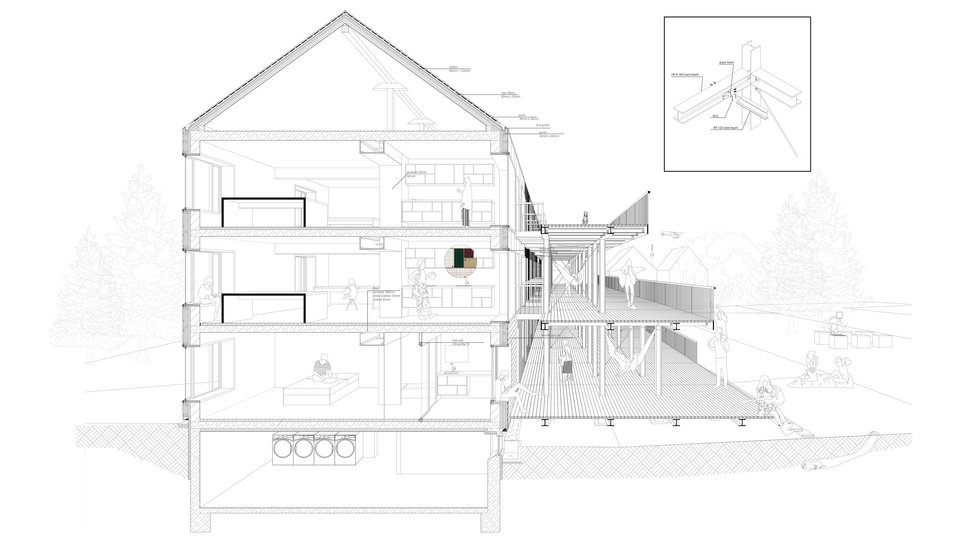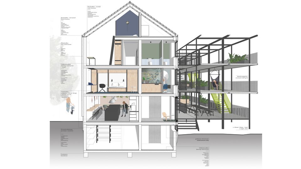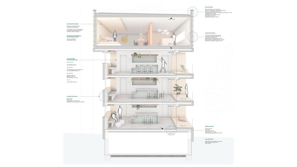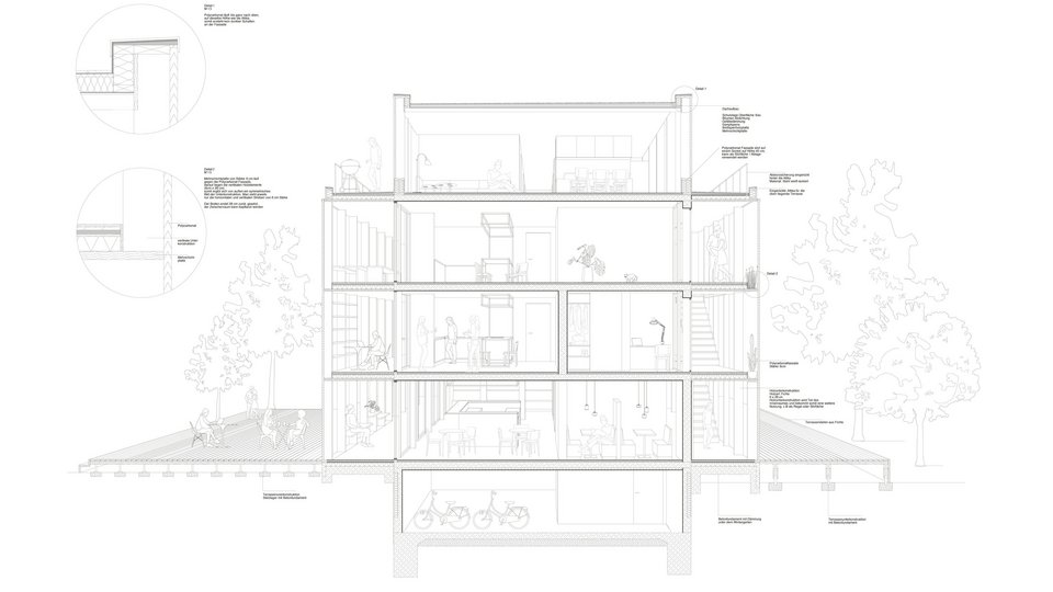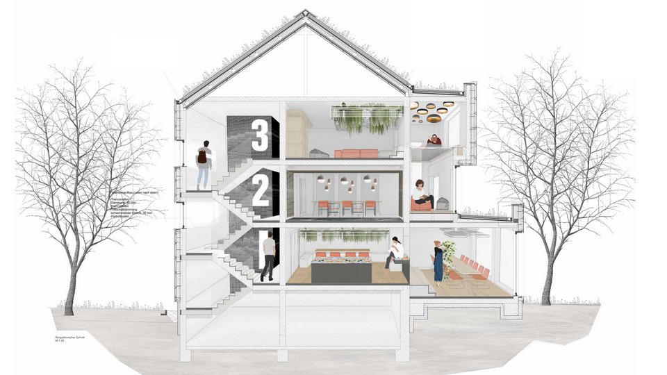 In her work, Franziska Ottilie Geesmann consistently reflects on the difference between family life in the post-war period when the buildings were created and today's situation, which makes social structures outside the family increasingly important. Whereas in the past it was individual apartments with small rooms within the apartment, today it is a house family thrown together. The design tries to give everyone their space, a place to cook, eat and laugh together.