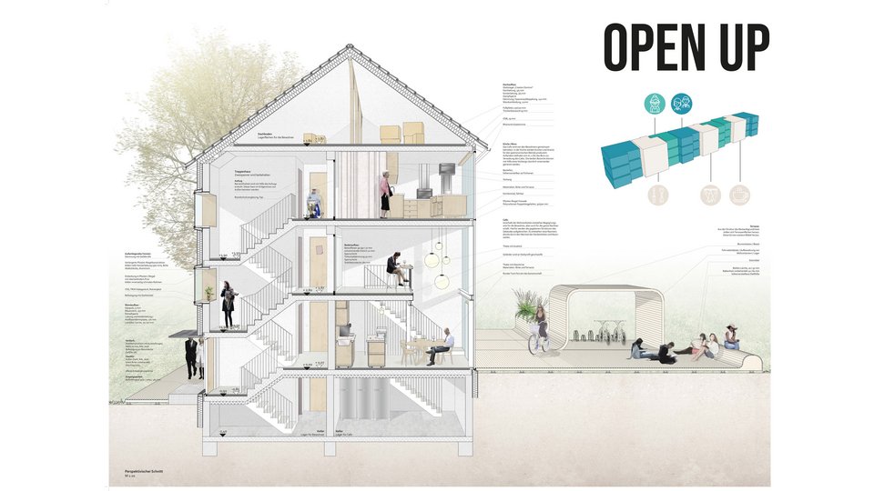 The AddUnity project by Annika Schürk, Ann-Kathrin Simon and Judith Lapp is focused on community. To counteract the prevailing anonymity in the monotonous row buildings of the area in Stuttgart Rot, new open spaces are created with old stock.