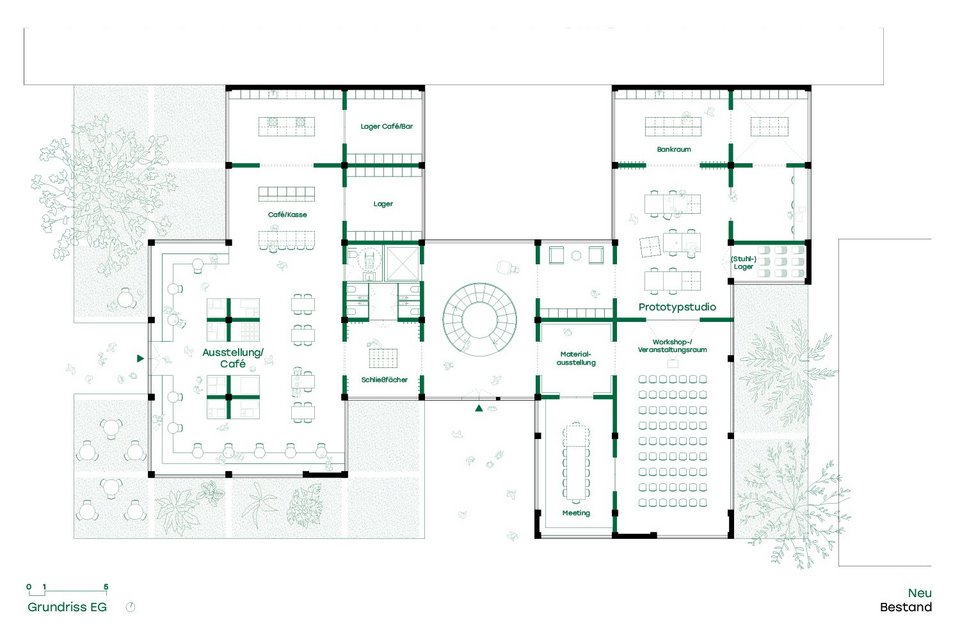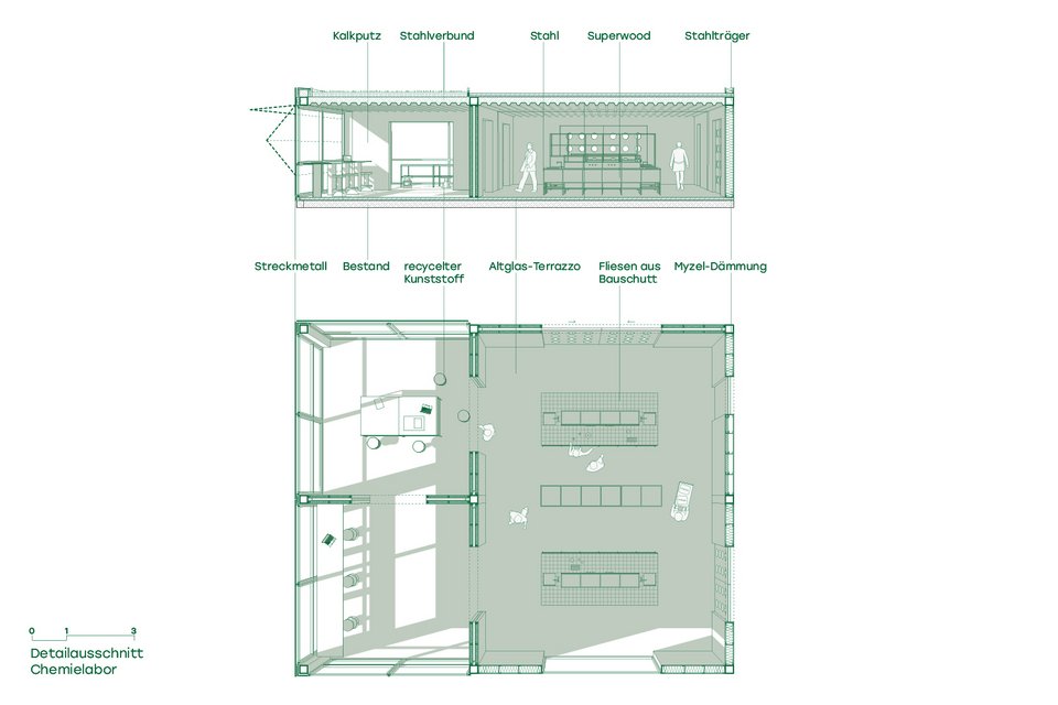 At Circulab, research teams and start-ups will have the opportunity to test prototypes, network and grow with the help of special funding programs (such as the German government's Cultural and Creative Industries Initiative). The different approaches of the individual research teams enrich the scientific work and give rise to new ideas. The premises at Circulab cover a wide range of requirements: in addition to various workshops, there is an office area, a chemistry and biology laboratory with a clean room, as well as a garden. The open-plan workspaces encourage collaborative, interdisciplinary use. The flexible floor plan structure makes it possible to rearrange the rooms again and again.