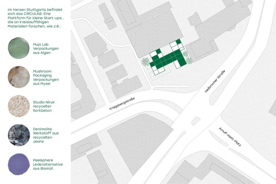 Circular material innovations made from algae, fungi, waste or recycled materials have become increasingly important in recent years. Used in packaging, furniture, clothing or the construction industry, they make a significant contribution to achieving climate neutrality and, in the long term, must be increasingly integrated into our everyday lives. This is why the Circulab is to be built in the heart of Stuttgart, at Kriegsbergstraße 28: A place where research into recyclable materials can be driven forward and new ideas can be developed, tested and communicated.
