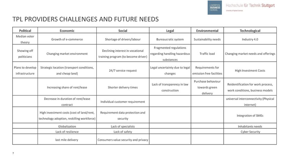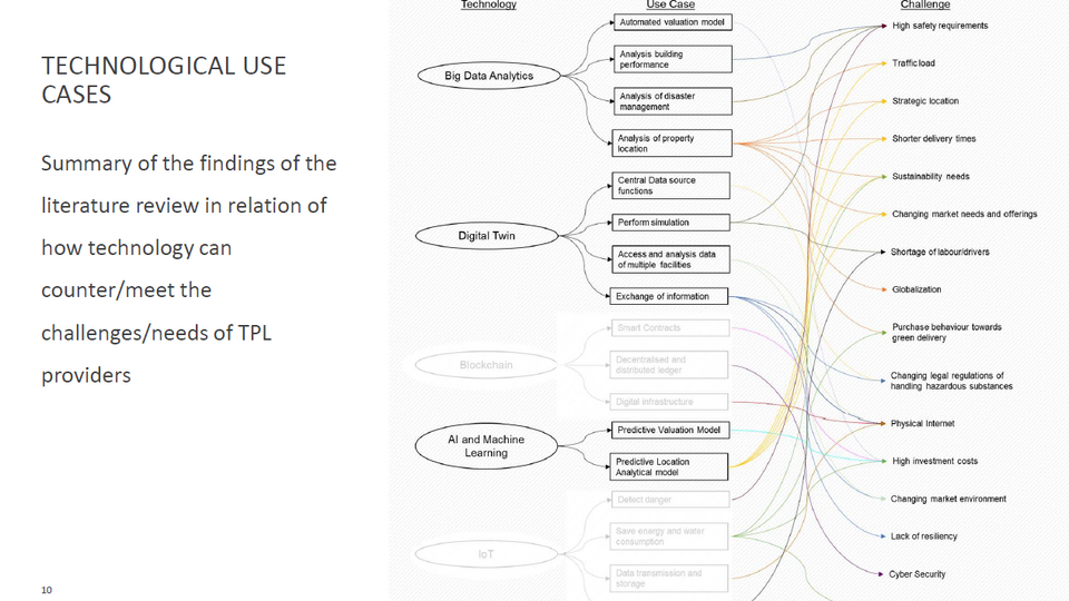 A growing number of companies are resorting to third-party logistics (TPL) providers to achieve customer satisfaction and survive in a tough competitive market. However, TPL providers are struggling to fulfil their requirements. They need to redefine their business models and find new solutions to increase their competitive advantage. Logistics real estate (LRE) can support TPL providers by increasing the value of the logistical properties. LRE can invest in equipping the logistical properties with technologies such as digital twin for the warehouse to help TPL providers be flexible in the redesigning the warehouse or performing traffic simulation to improve their operations. This study aimed to help LRE decide which technology to invest in by identifying the most prominent technologies for the TPL providers. It explored the challenges and future needs that TPL providers in Germany face and investigated which technologies can counter these challenges or satisfy the needs. The study introduced a tool to assess and compare different technologies in relation to their usefulness to the TPL providers. The study also extended its focus to capture the user of the logistical property acceptance of the technologies. This should help TPL providers understand how the users of the logistical properties perceive different technologies and how the TPL providers influence their perception. A hybrid technology acceptance model, which combined innovation diffusion theory, technology acceptance model and two more variables, was designed to capture the user’s behavioural intention to use technologies.